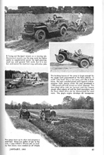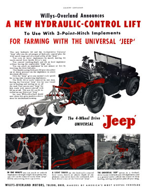 We've collected several examples of ads featuring "Farm Jeeps" equipped with hydraulic implement lifts. Most of the advertising shows Monroe lifts, however the lower right-hand picture in the "Working Girl" ad features a Newgren. The Jeeps themselves in these ads are CJ-2As and CJ-3As, even though enthusiasts will tell you the official "Farm Jeep" was a CJ-3B. The 1951 "4-WHEEL-DRIVE FARM VEHICLES" ad featuring either CJ-2As or CJ-3As shows the marketing department had the “Farm Jeep” concept several years before the official model designation in 1953-54.