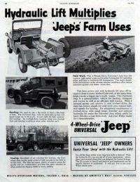 The Monroe lift, which enables the Jeep to use standard 3-point farming implements, along with the optional rear power take off (PTO) unit allows the Jeep to function as a light duty utility tractor.