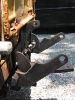 lift here The lift weighs over a hundred pounds and is shaped something like a “T”. Using a combination of floor and bottle jacks, we were able to position the lift and raise it to match the mounting holes on the bumper. That was the good news. When Barry had removed the drawbar, the tie-in bar to the frame on the driver’s side had been broken loose. At some point in the past, the PO has pulled really hard on the corner of the jeep. The bumper is bent out enough so that the hole on the rear cross member of the lift and the hole on the frame cross member are about ½” apart. And for some reason, the lift frame is hitting the body and will not go up as far as needed to meet the frame cross-member. Rather than fight