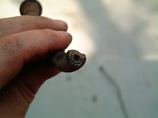 While Evan had worked on removing the head, Barry returned to the brake problems. As described in Part three, the Jeep appears to have had one operational brake (passenger rear) for some time. All of the wheel cylinders appeared to be leaking and would need to be replaced. The metal brake lines appear to have been replaced at some distant point. The PO apparently purchased standard length brake lines and wrapped them around a beer can to shorten them to proper length. The rubber hoses (there are four) looked original and had to be replaced. Luckily, new wheel cylinders and hoses are available, so those were ordered.