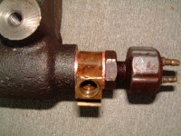 Evan supplied the foot power, stepping on the pedal, while Barry watched for leaks. There were plenty! Most of the leaks were quickly fixed by simply tightening the connection. A leak at the master cylinder presented more of a challenge. Copper washers are used between the master cylinder and the brake line connector. We had tried to reuse the old washers when we replaced the master cylinder, but they leaked. We were able to find similar, but not exact washers at NAPA and had filed and cut them to fit. It took several tries with Evan and Barry taking turns trying to tighten the fitting.
